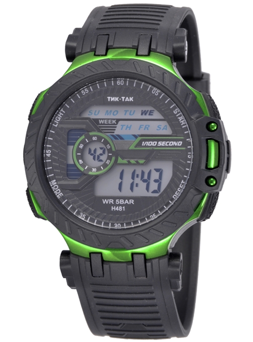 |  нажмите для увеличения | Электронные часы ТИК-ТАК Н481 WR50 черно-зеленые | Материал корпуса | Пластик | | Размеры корпуса | | | длина | 47 мм. | | ширина | 46 мм. | | толщина | 16 мм. | | Материал ремешка/браслета | PU | | Длина часов с ремешком | 240 мм. | | Механизм | Электронный с LCD дисплеем | | Особенности | 12/24 формат времени, дата, будильник, секундомер, подсветка. Водонепроницаемость 50м. | | Комплектация | Прозрачный пакет, паспорт, инструкция по эксплуатации и гарантийный талон |
