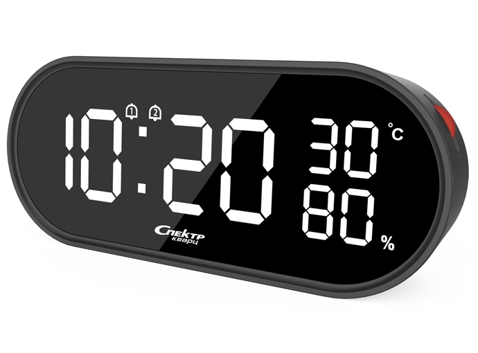 |  нажмите для увеличения | Светодиодные будильники СПЕКТР СК3215-Ч-Б | Материал корпуса | Пластик | | Размеры корпуса | | | высота | 77 мм. | | ширина | 185 мм. | | глубина | 50 мм. | | Механизм | Могут работать от батареек (АААх3шт) | | Особенности | Два будильника, snooze, формат времени 12/24 ч, плавная регулировка яркости индикации, показания температуры и влажности. Высота цифр 36,5 мм. USB шнур. Блока питания в комплекте нет. | | Комплектация | Упаковочная коробка Спектр, паспорт и инструкция по эксплуатации |